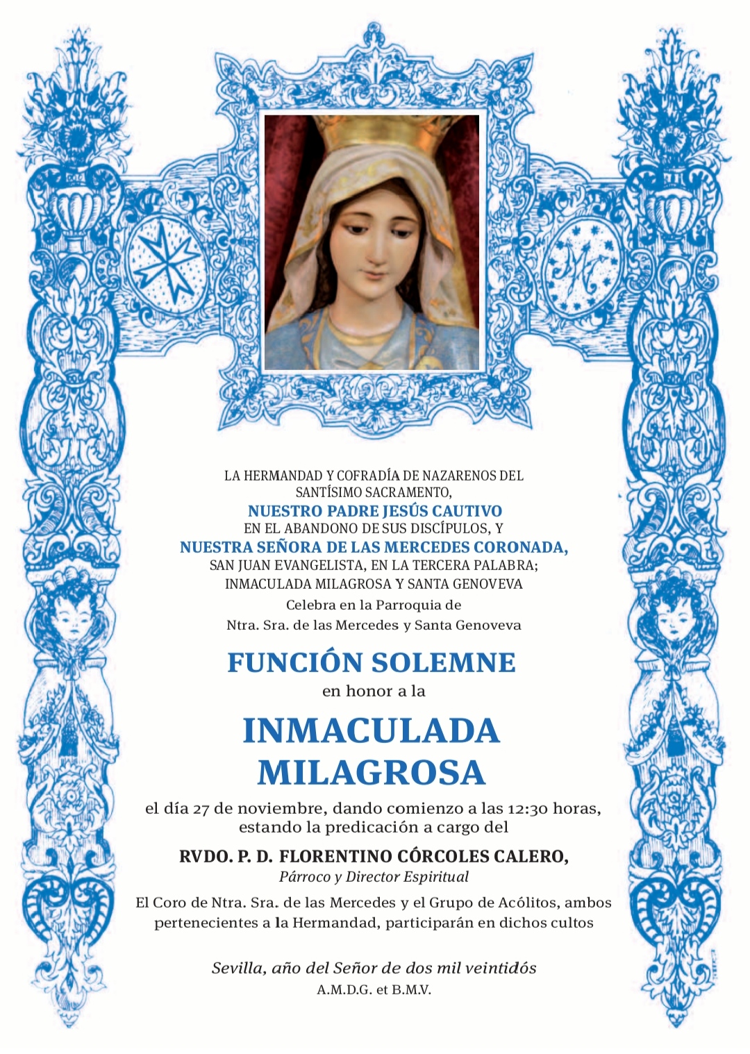 Nuestra Señora de las Mercedes Coronada, procesionará de manera extraordinaria a la Santa Iglesia Catedral de Sevilla el próximo viernes, 30 de septiembre, con motivo del L aniversario de la imposición de la Corona y XXV de la posterior proclamación de rango canónico. El sábado 1 de octubre, en horario vespertino, realizará procesión triunfal de regreso a nuestra Parroquia. Los hermanos que deseen formar parte del cortejo deberán seguir las siguientes normas de participación.