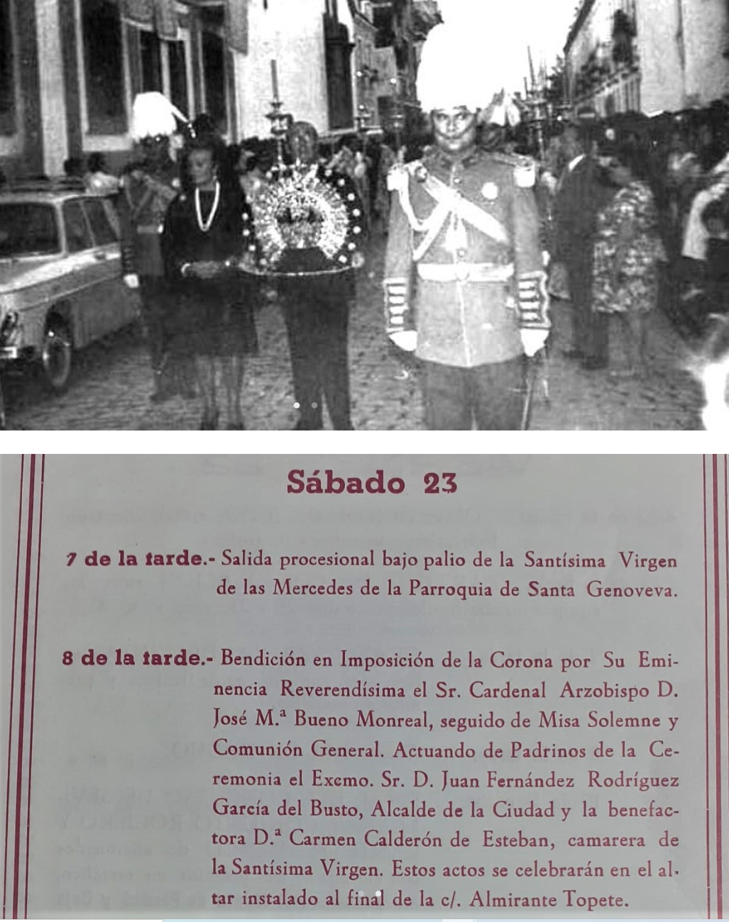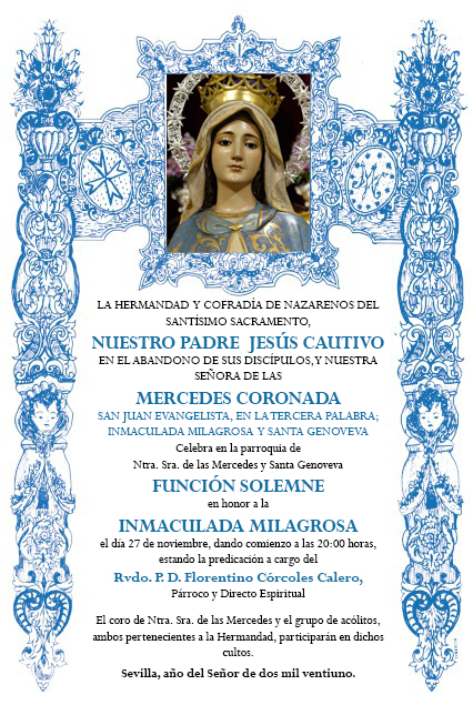 En la tarde del próximo día 30 de septiembre, con motivo del 50 aniversario de la imposición de la corona a nuestra bendita Madre de las Mercedes como ofrenda de amor de todos nuestros hermanos, fieles y devotos, y el 25 aniversario del posterior reconocimiento del rango canónico de dicha Coronación, nuestra amantísima Titular realizará traslado a la Santa Iglesia Catedral de Sevilla, en su paso de palio, para la celebración, el sábado día 1 de octubre a las 11:00 h., de la Solemne Misa Estacional oficiada por el Excmo. Rvdmo. Arzobispo de Sevilla, D. José Ángel Saiz Meneses. En la tarde del citado día 1 de octubre, Nuestra Señora de las Mercedes Coronada realizará procesión triunfal de regreso a nuestra Parroquia.
