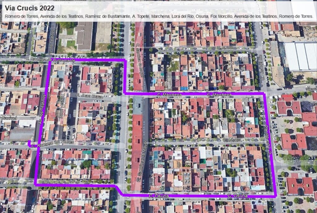 Parroquia de Ntra. Sra. de las Mercedes y Santa Genoveva – Romero de Torres – Avenida de los Teatinos – Serrano y Ortega – Almirante Topete – Coullaut Valera – Avenida Cardenal Bueno Monreal – Tello de Guzmán – Ntra. Sra. de las Mercedes – Felipe II – Jesús de la Victoria – Porvenir – Río de la Plata – San Salvador (Parroquia de San Sebastián) – Santa Rosa – Montevideo – Avenida de la Borbolla – Capitanía General – Avenida de Portugal – Avenida El Cid – Interior de la Lonja Universidad de Sevilla (Hermandad de los Estudiantes) – San Fernando – Puerta de Jerez – San Gregorio – Plaza de la Contratación – Miguel Mañara – Plaza del Triunfo – Plaza Virgen de los Reyes – Puerta de Palos de la Catedral.