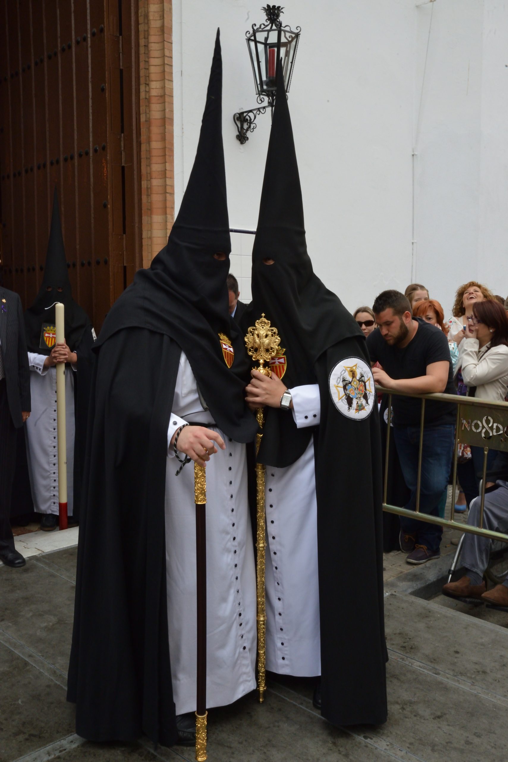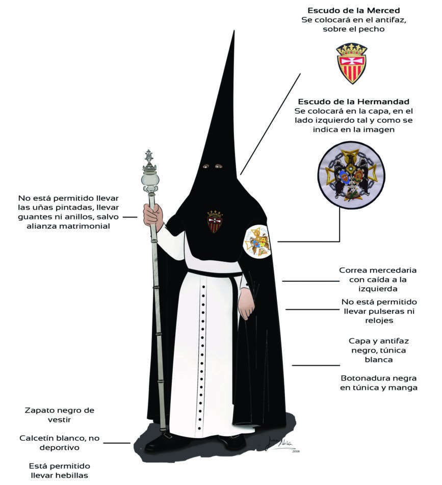 Los hermanos nazarenos han de participar en la estación de penitencia con el hábito y escudos propios de la Hermandad, según diseño y calidad fijado por la Junta de Gobierno, sin usar otros distintivos, prohibiéndose el uso de cualquier objeto de adorno o alhaja, a excepción del anillo nupcial. El hábito estará compuesto de túnica blanca, ceñida con correa mercedaria que cae al lado izquierdo, capa y antifaz negros; sobre la capa, al lado izquierdo y a la altura del brazo, el escudo de la Hermandad; y sobre el antifaz el de la Merced. Llevarán calcetines blancos y zapatos negros. Sobre la túnica y bajo el antifaz llevarán la medalla de la Hermandad.