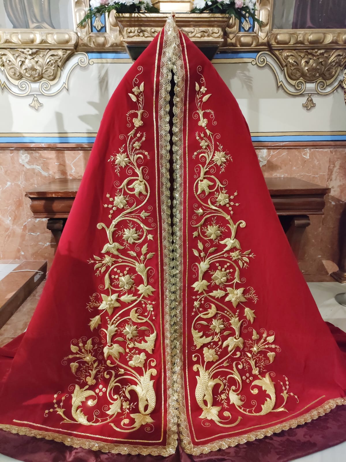 El nuevo manto de la Virgen de las Mercedes, diseñado y bordado por nuestro Hermano Alfonso Torralva Navarro y donado a la Santísima Virgen para conmemorar el cincuentenario de su Coronación.