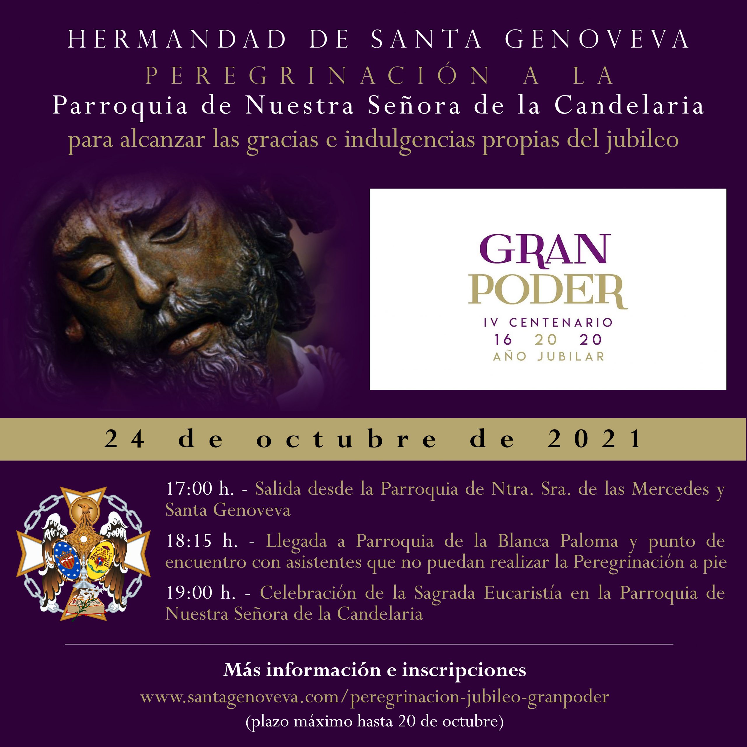 El próximo domingo, 24 de octubre de 2021, nuestra Hermandad realizará peregrinación a la Parroquia de Nuestra Señora de la Candelaria, con motivo del año Jubilar que celebra nuestra hermana Hermandad de Nuestro Padre Jesús del Gran Poder. Es necesario, para obtener las gracias e indulgencias propias del jubileo, cumplir los siguientes requisitos: Confesión, Comunión Eucarística y oración por las intenciones del Santo Padre, (rezando un Padre Nuestro, un Ave María y el Gloria).