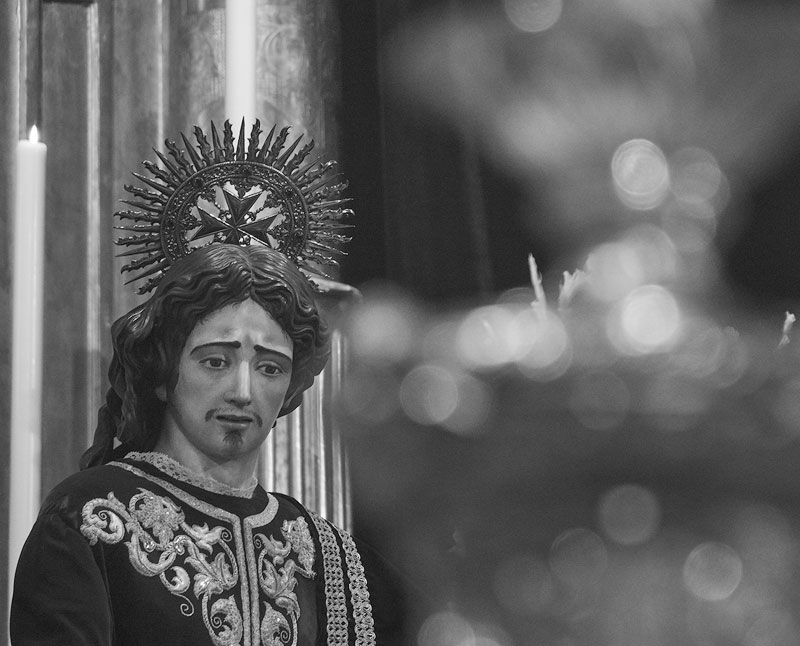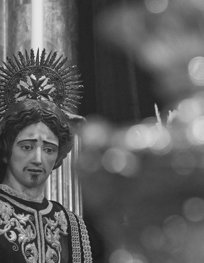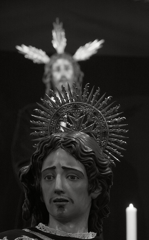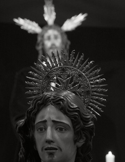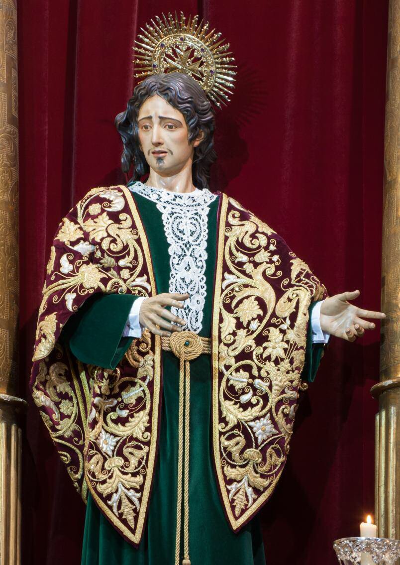 La imagen de San Juan Evangelista, es la tercera de las imágenes que fue encargada a José Paz Vélez. Retrocedamos en el tiempo. Cuando ya recibían culto las imágenes de nuestro Padre Jesús Cautivo y Nuestra Señora de las Mercedes, algunos miembros de la Hermandad propusieron que se le encargara a nuestro imaginero la realización de una imagen de San Juan que recogiera el pasaje evangélico en el que Jesús encomienda al Discípulo Juan el cuidado de su madre, es decir, lo que nosotros conocemos como San Juan “en la Tercera Palabra”.