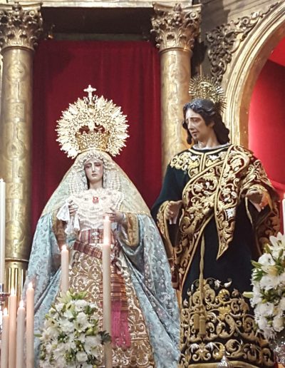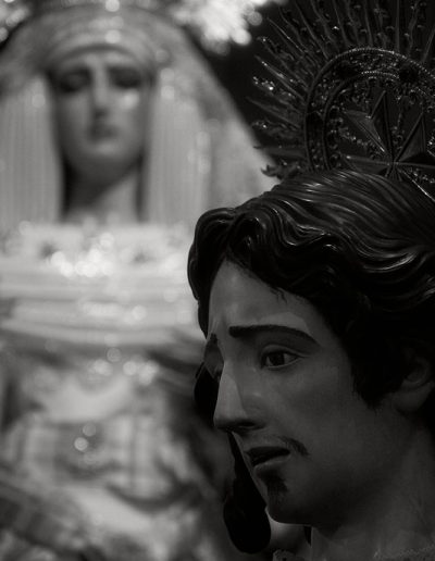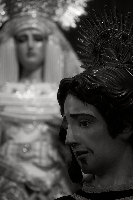 Desde el principio, el discípulo Juan ha sido considerado como patrón de la Juventud, por ser el más joven de los apóstoles que acompañaban a Jesús. Es por ello por lo que los rasgos fisonómicos de San Juan son los habituales: rostro aniñado, barba y bigote incipiente y manos giradas hacia un lado, como queriendo indicar a María, a quien iconográficamente acompaña, un camino de seguimiento de Jesús, camino que fue ella misma quien inicio en la casa de Nazaret. La melena no es demasiado larga, pero si rizada y movida, y las cejas aparecen nuevamente fruncidas, largas y perfiladas, así como la boca también un tanto entreabierto. Son rasgos propios del estilo del autor que se mantienen en nuestras imágenes, a los que se añade el hecho que, del mismo modo que en la imagen de Jesús Cautivo, el cabello queda algo recogido en la parte izquierda, dejando también visible dicha oreja. El rostro no es demasiado grande y la expresión de los ojos es triste, presentándolos incluso llorosos. El modelado es igualmente suave, y las formas redondeadas, imprimiéndolo una vez más la misma dulzura y suavidad que forman parte de la personalidad artística de Paz Vélez.