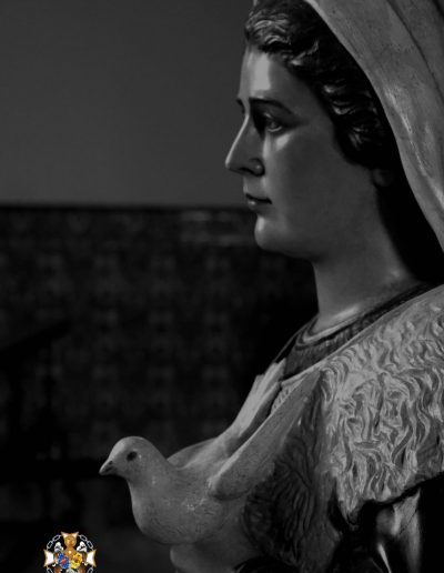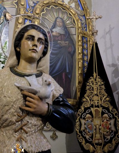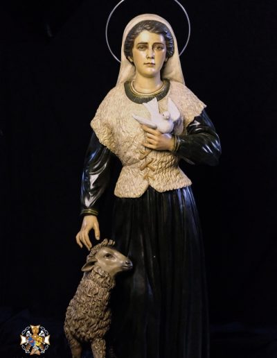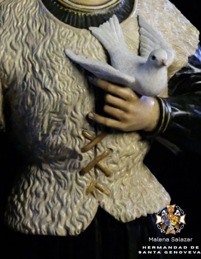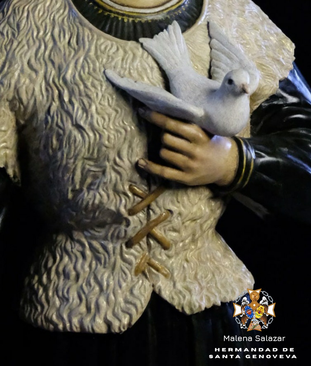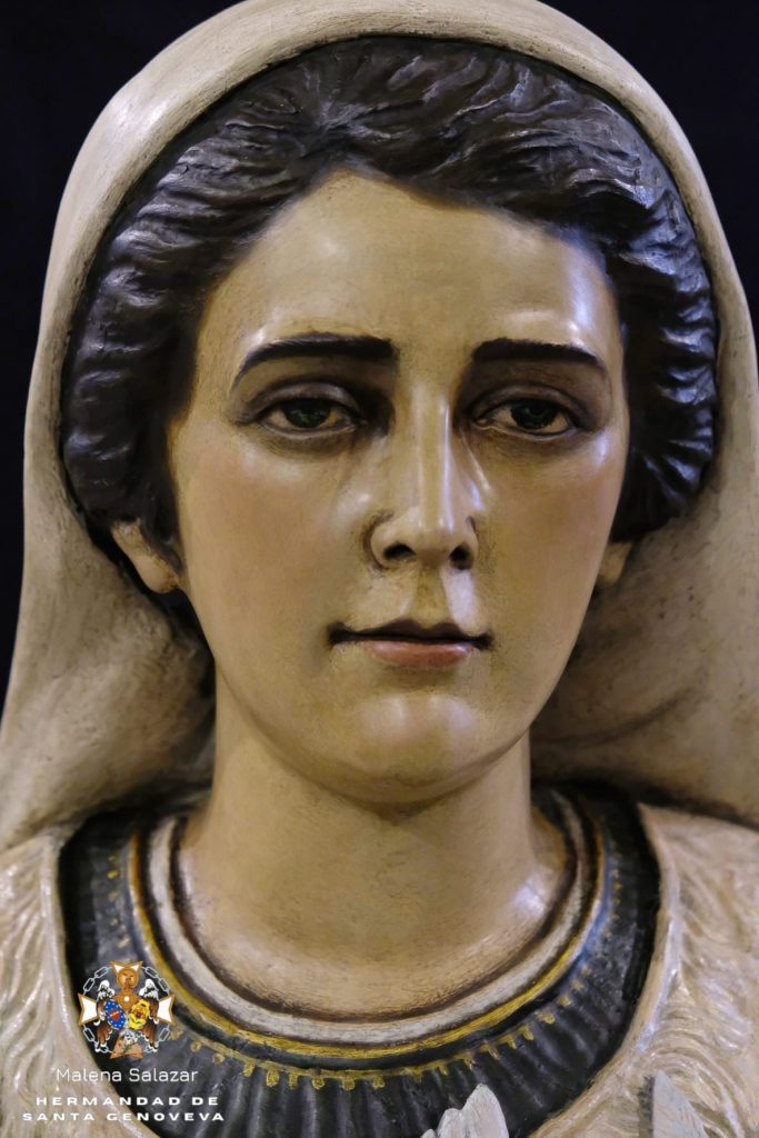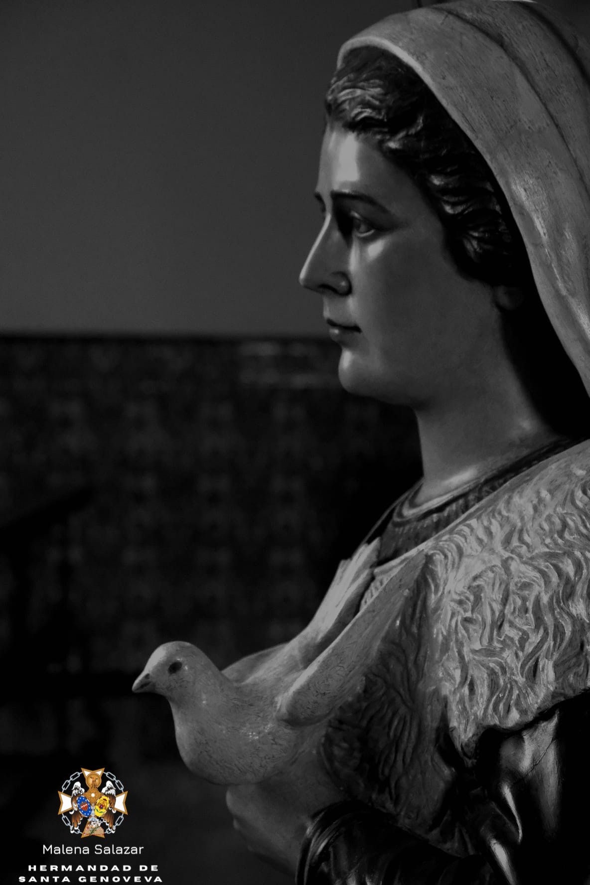 La imagen de Santa Genoveva que se conserva en la parte superior del altar mayor de nuestra Parroquia, y está flanqueada por candelabros que pertenecieron al paso de la Milagrosa, pertenece al taller de Antonio Castillo Lastrucci. Está realizada en madera policromada y es de tamaño algo menor al natural. La imagen nos presenta a una Santa aún joven, con un rostro bello y redondeado, y el cabello tallado y recogido bajo un pequeño manto que le cubre la cabeza. El resto de la indumentaria consiste en un sencillo vestido ceñido a la cintura, por una piel de borrego, que el autor se dispuso a tallar con el relieve propio de este tejido, que presenta una textura rugosa. Los pliegues son gruesos y redondeados, lo que le otorga a la imagen un aspecto un tanto voluminoso, que hace que pueda ser bien percibido desde el suelo. En último lugar, hay que destacar los símbolos de santidad que porta la imagen, como son la diadema (a modo de aureola) y la paloma en su mano izquierda (en alusión al Espíritu Santo).