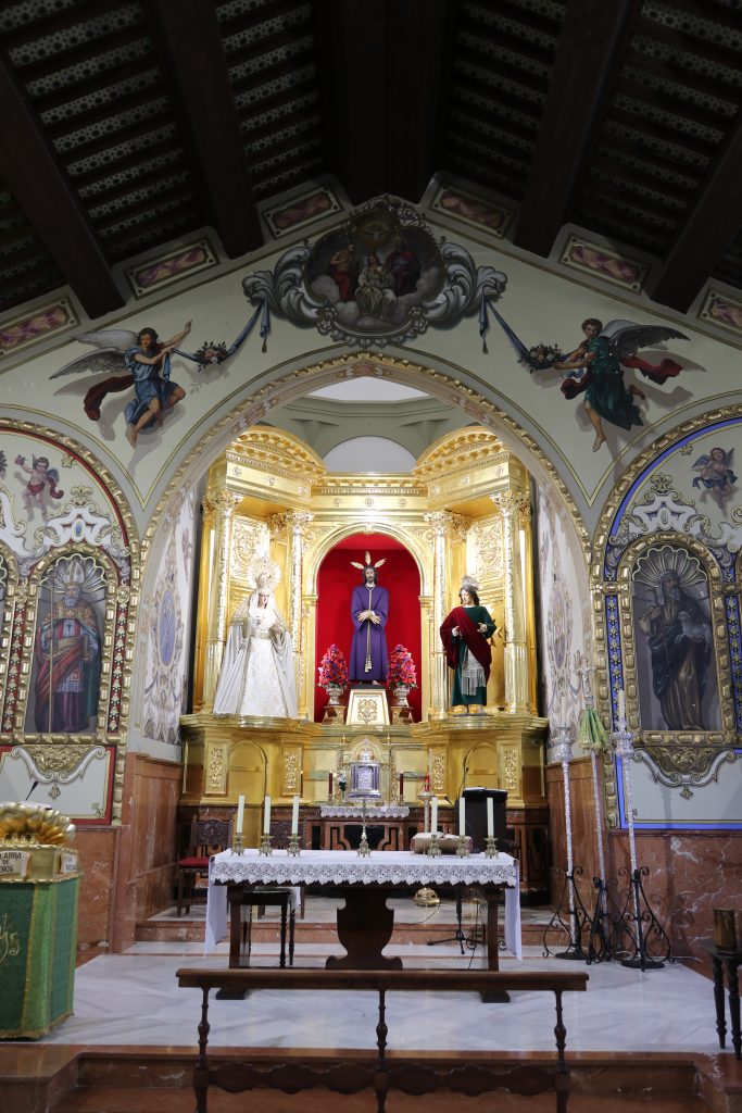Una vez que penetramos en el templo, lo primero que apreciamos es el hermoso altar principal del mismo, situado en el Presbiterio. Este Retablo Mayor, obra del maestro Dionisio González de fines del XVIII de estilo neoclásico, pertenecía en origen a la Hermandad de la Alegría de San Bartolomé. Este fue comprado por un grupo de hermanos fundadores de la cofra- día allá por el año 1968, siendo el retablo de un solo cuerpo que se divide en tres calles, aunque hubo que adaptarlo mediante la inclinación de los laterales.