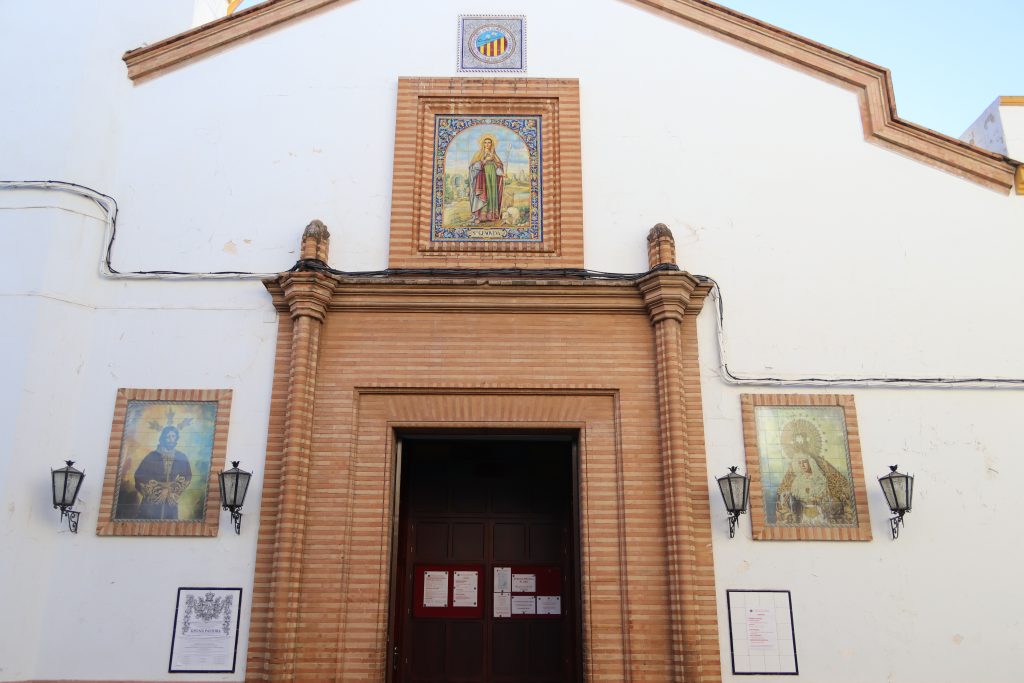 Sobre el portalón se erige un tercer retablo, que es el que representa a Santa Genoveva. En la fachada que da a la calle Romero de Torres se abre un gran portalón que se utiliza para la salida procesional de la Cofradía. El templo hace esquina de una manzana de viviendas, las cuales están adosadas en la cabecera.