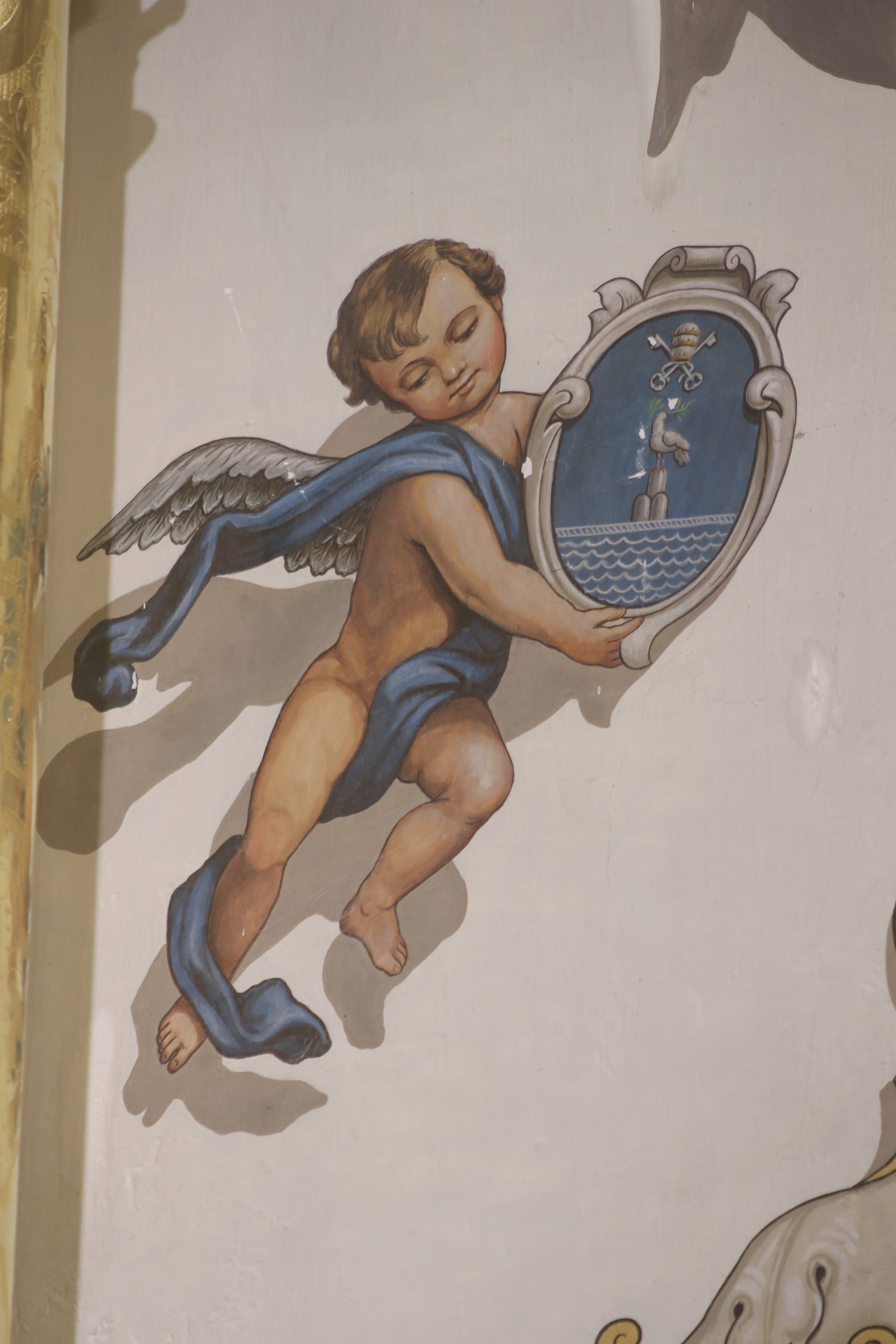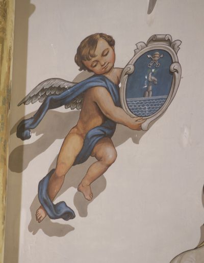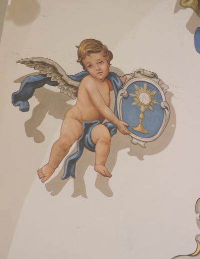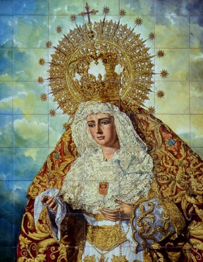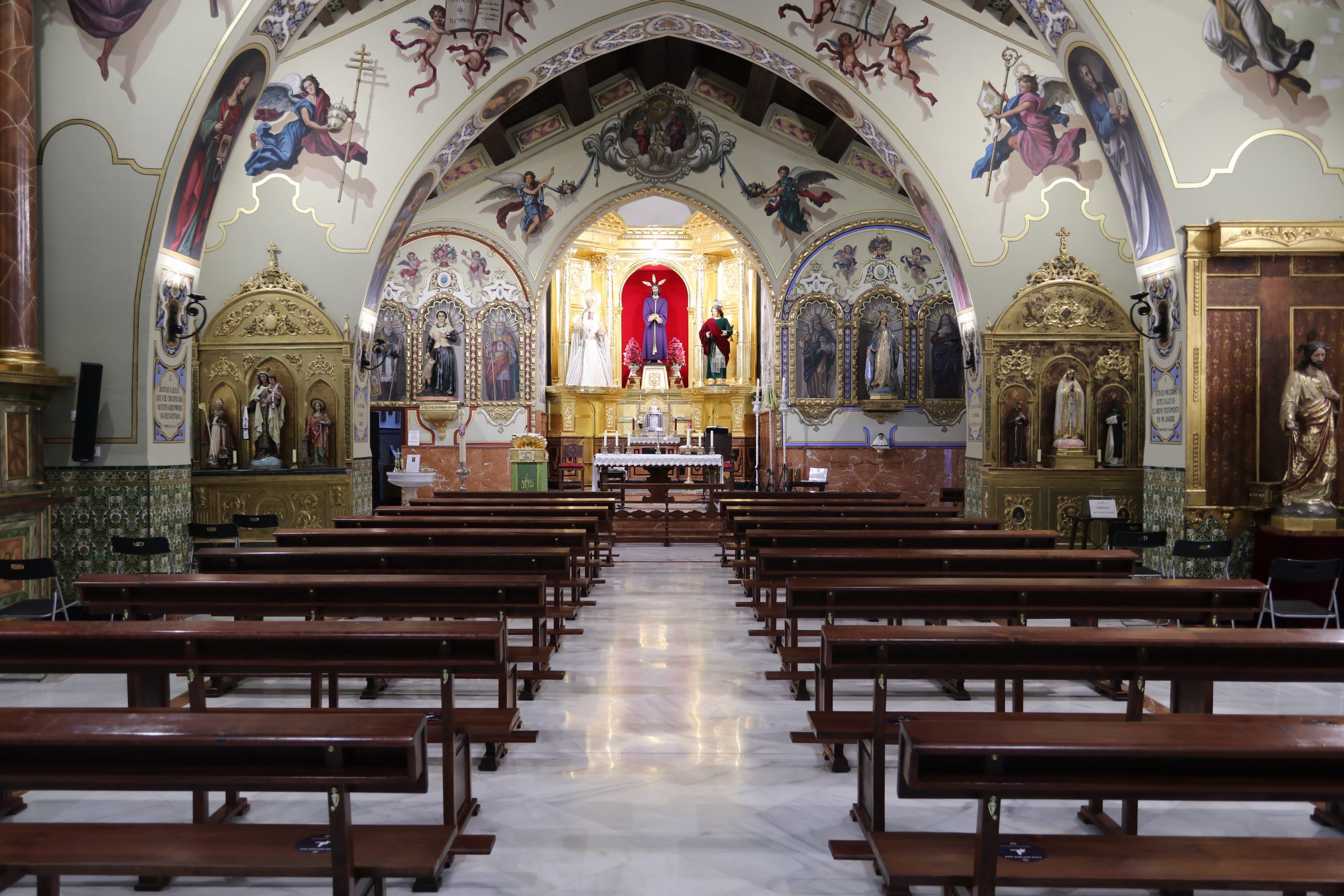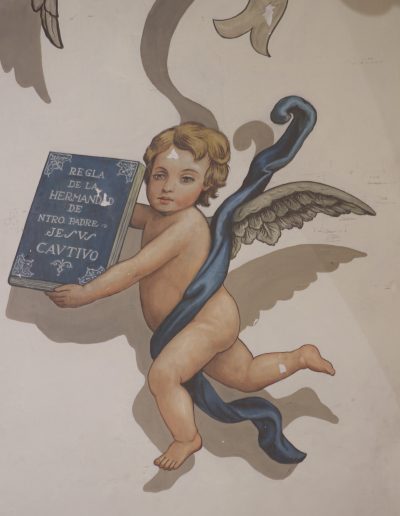 Todas estas pinturas, excepto las de los altares del Presbiterio, son obras a finales de los años setenta de D. Rafael Rodríguez, el mismo que realizó las del interior de la Basílica de la Macarena, habiéndose restauradas en los últimos años, coincidiendo con la reforma y mejora de las techumbres de la propia Parroquia.