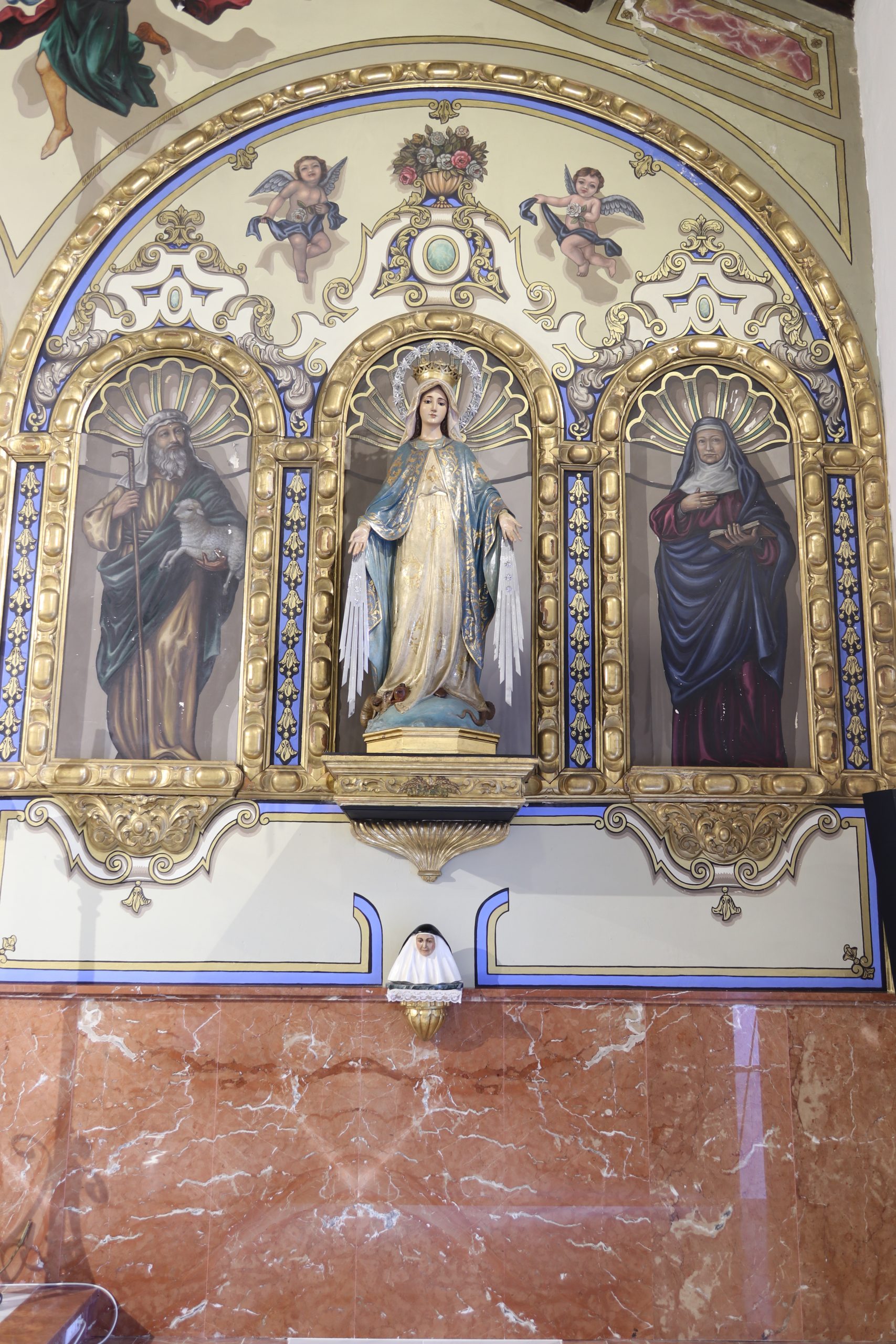 Antes de la remodelación a la que ha sido sometido el Altar, éste se remataba por una hornacina que alojaba la imagen de Santa Genoveva, obra de D. Antonio Castillo Lastrucci en 1940, y que se representa con una paloma en el brazo izquierdo y una oveja junto a su lado derecho. Esta imagen es contemporánea a la construcción de la Iglesia.