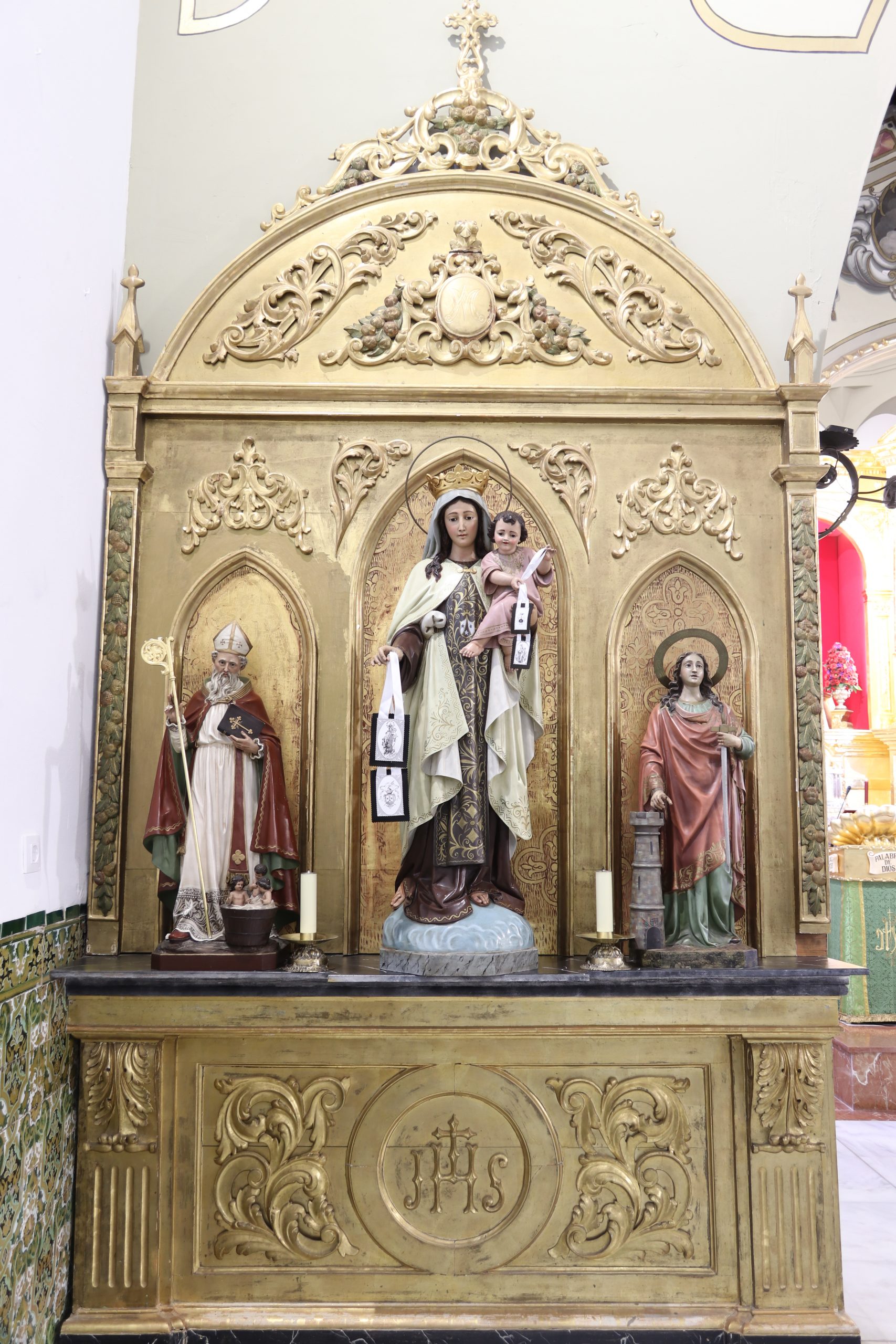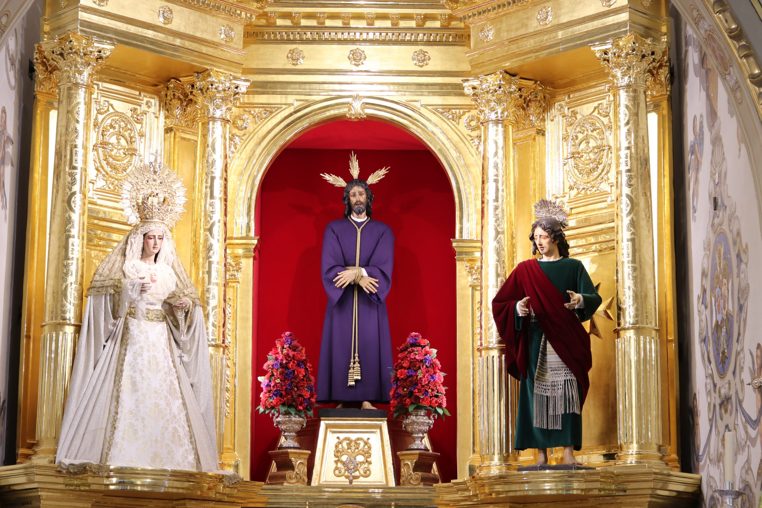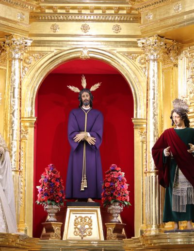 En la parte central del retablo se sitúan nuestros Titulares: la imagen de Nuestro Padre Jesús Cautivo en el abandono de sus discípulos, Nuestra Señora de las Mercedes Coronada y San Juan Evangelista.