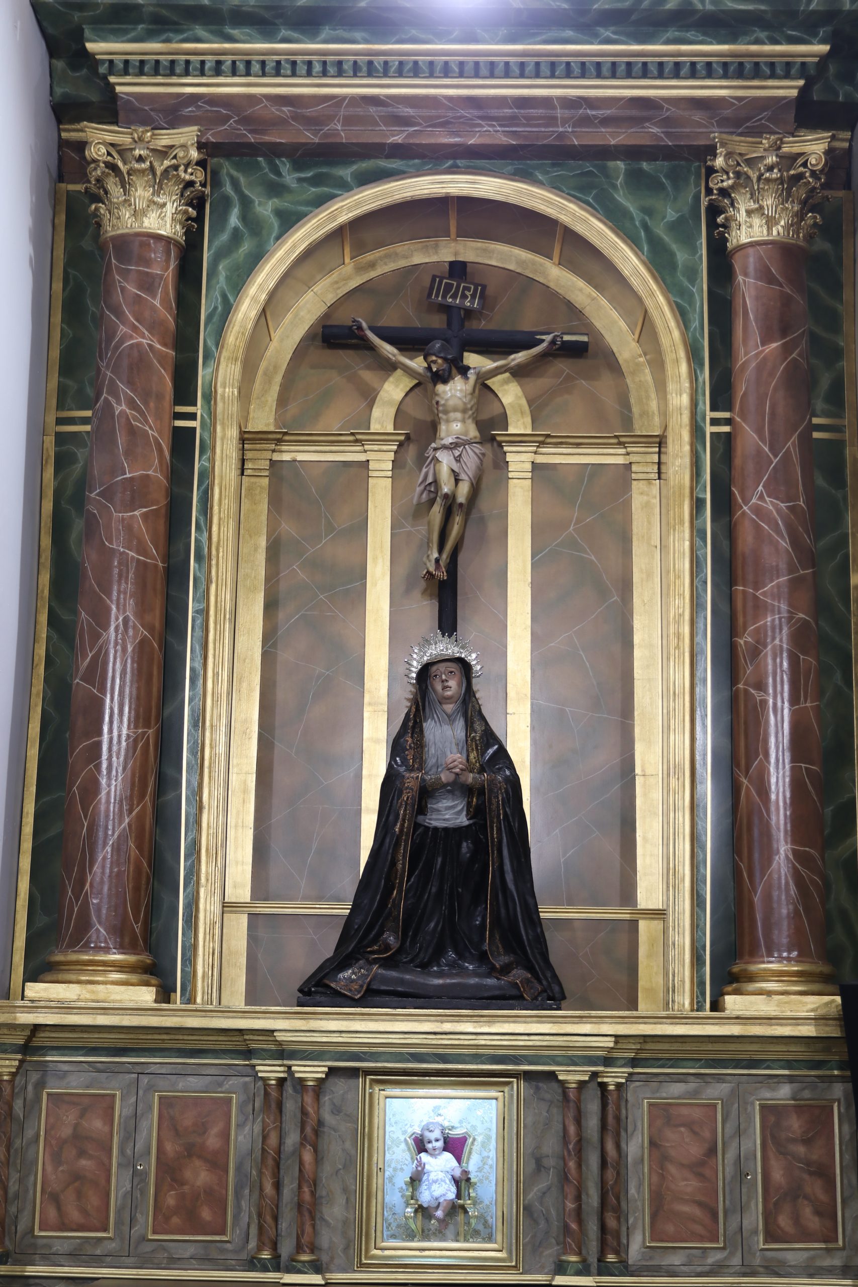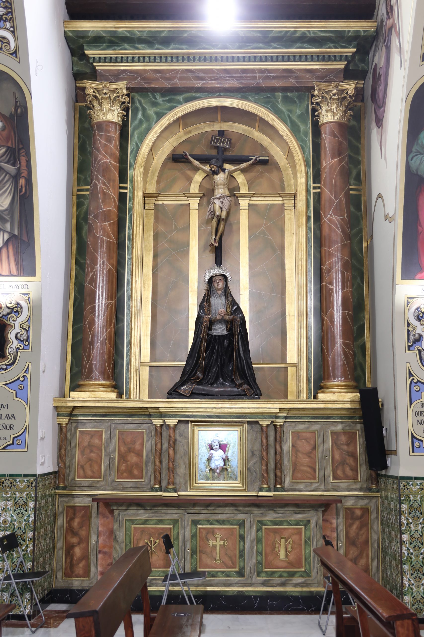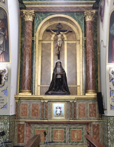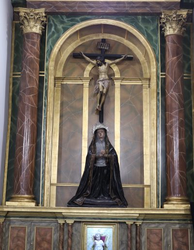Destaca en lado izquierdo de la Parroquia, un altar que rompe la estética de la Parroquia, obra de Juan de Astorga del siglo XVII, y en el que antiguamente se situaban las imágenes titulares de la Hermandad. Éste era el altar original de la parroquia, que tras la adquisición del otro en el año 1968 fue desplazado hasta aquí. Entonces presidía el Templo y en su centro se hallaba la talla de Santa Genoveva, que antes citamos. Ahora alberga un crucificado de pequeño tamaño sin documentar y una dolorosa a sus pies que entrelaza sus manos, y a la que se la ha venido llamando popularmente como “Virgen de los Dolores”. Este retablo perteneció a la Hermandad que todo el mundo conoce por El Silencio.