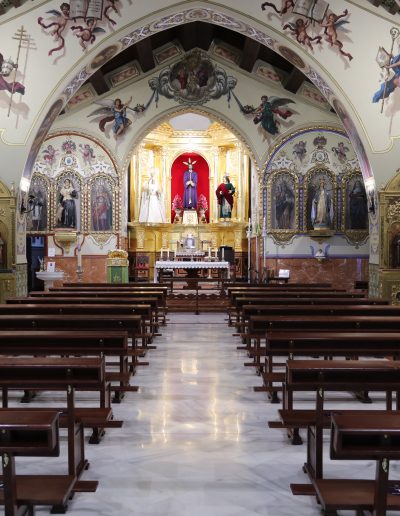 Una vez que penetramos en el templo, lo primero que apreciamos es el hermoso altar principal del mismo, situado en el Presbiterio. Este Retablo Mayor, obra del maestro Dionisio González de fines del XVIII de estilo neoclásico, pertenecía en origen a la Hermandad de la Alegría de San Bartolomé. Este fue comprado por un grupo de hermanos fundadores de la cofra- día allá por el año 1968, siendo el retablo de un solo cuerpo que se divide en tres calles, aunque hubo que adaptarlo mediante la inclinación de los laterales.